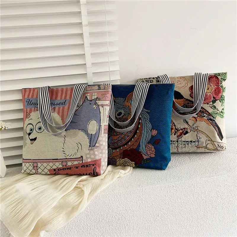 Fashion Ethnic Style Cartoon Embroidered Pattern Large Capacity Women Canvas Tote Bag