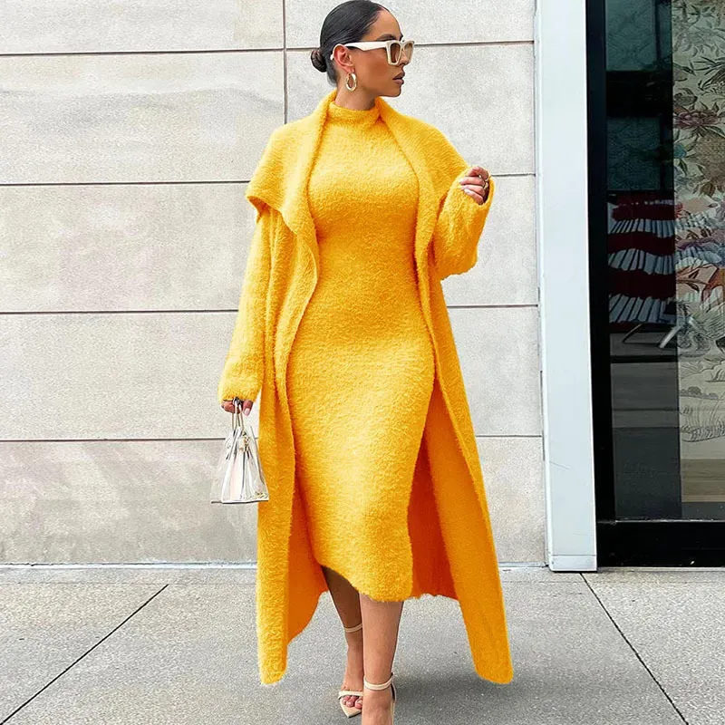 Autumn And Winter Women Fashion Solid Color Plush Dress Long Coat Lace-Up Two-Piece Set