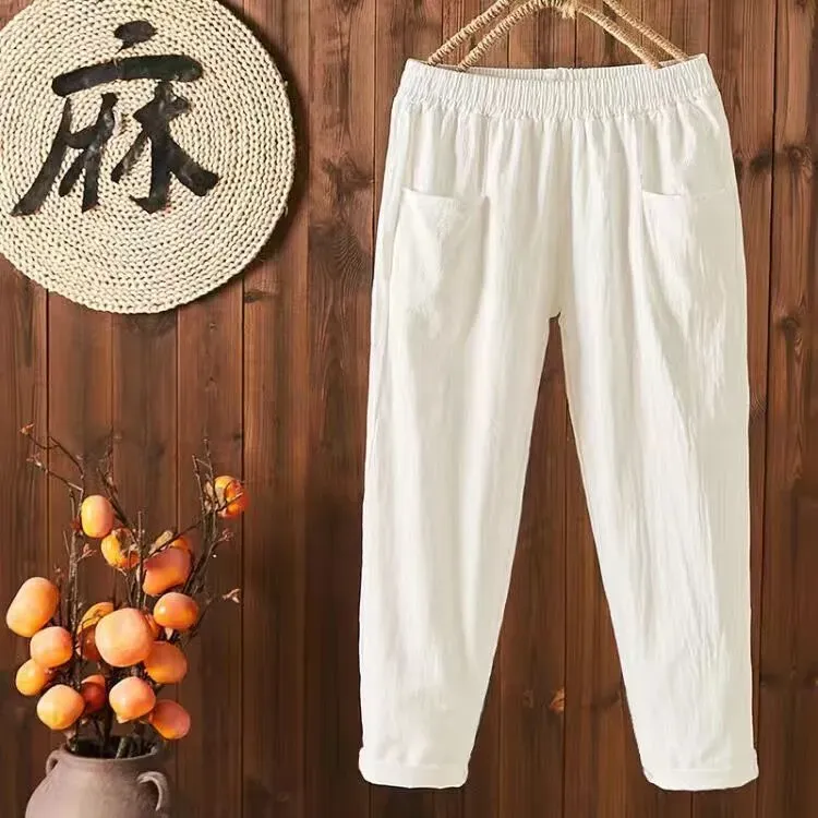 Women Casual Solid Color Cotton And Linen High Waist Pants