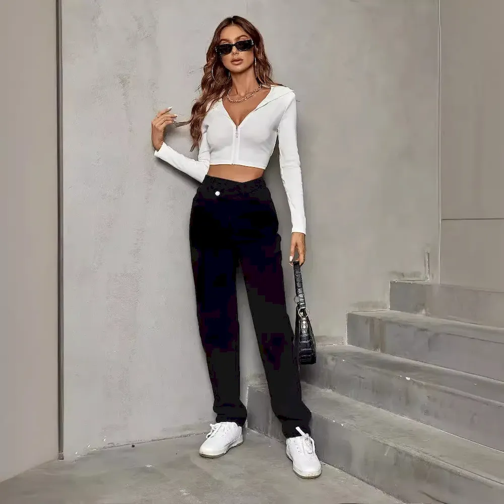 Women Fashion Basic Straight Denim Pants Cotton Mid-Waist Black Washed Jeans