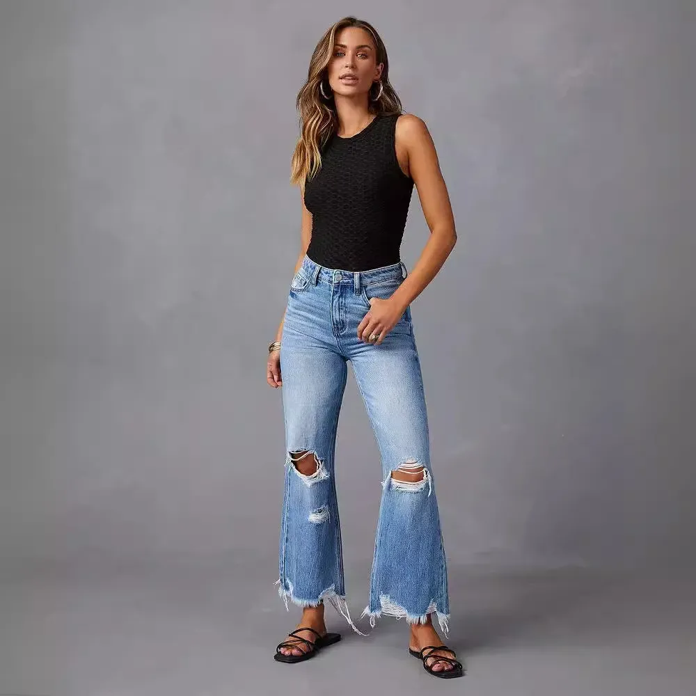 Women Casual Ripped High-Waist Straight Raw Hem Jeans