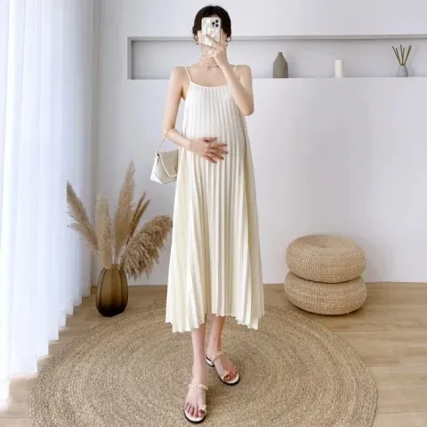 Pregnant Women Casual Loose Solid Color Pleated Camisole Dress
